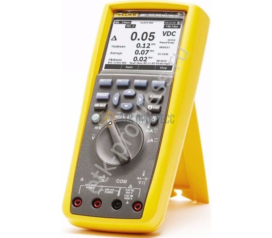 Регистрирующий мультиметр TrueRMS Fluke 287: Базовая погрешность 0,025 %; Постоянное/переменное напряжение 1 мкВ – 1000 В (45 Гц – 100 кГц; True RMS; AC+DC); Постоянный/переменный ток 10 нА – 10 А (45 Гц – 20 кГц; True RMS; AC+DC); Сопротивление 10 мОм – 500 МОм; Проводимость 10 пСм – 500 нСм; Емкость 1 пФ – 50 мФ; Частота 10 мГц – 1 МГц; ± коэффициент заполнения 10 – 90 %; ± длительность импульса 10 мкс – 1 с; -200...+1350 оС; -52 – 60 дБ/дБм; Максимальное индицируемое число 50000/50000 (основной дисплей/дополнительный); Линейная шкала; Автоудержание показаний; Регистрация максимальных/минимальных/пиковых (> 0,25 мс) значений; Относительные измерения; Встроенный SETUP; Графический дисплей, Экранное меню, Графопостроитель, Регистратор, Метки времени, Мультисессионная запись, Память 10000 отсчетов (запись и воспроизведение), USВ.