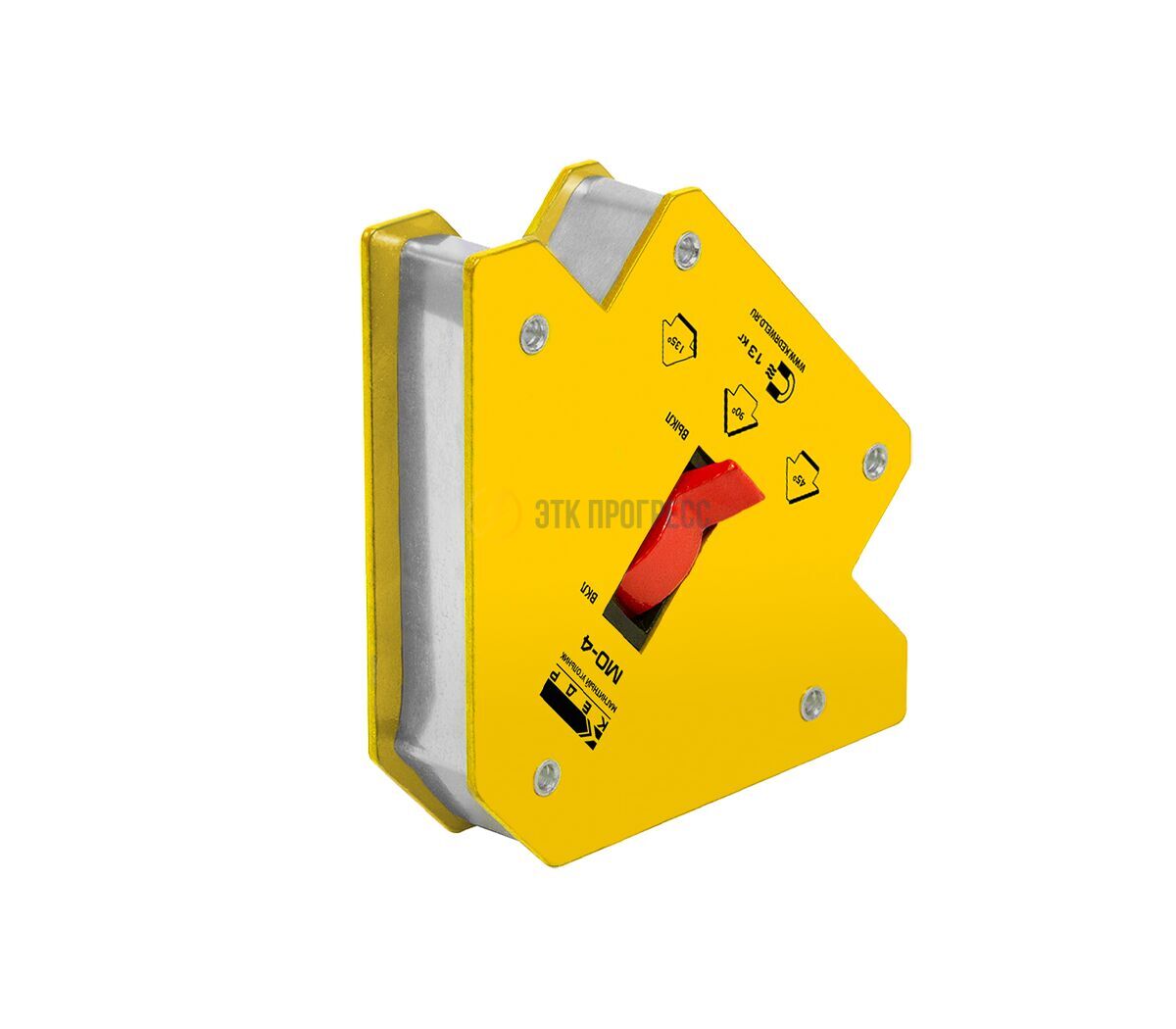 Магнитный угольник МО-4 позволяет производить точное выставление углов в процессе проведения сварочных работ, монтажа стальных конструкций, используется как элемент удержания деталей. Данное приспособление дает возможность осуществлять процесс сварки одному рабочему. Может быть использован для крепления элементов в процессе резки для предотвращения падения частей конструкций.