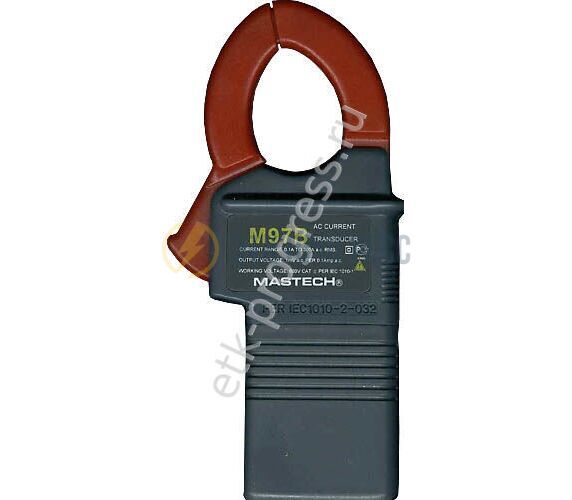Токовые клещи Mastech M97B представляют собой приставку к любому цифровому мультиметру Mastech. Они не имеют ЖК-дисплея - вывод значений измерений выводится на ЖК-дисплей мультиметра. Принцип действия токоизмерительных клещей M97B следующий. В зависимости от силы тока, протекающему по проводнику, на щупах клещей возникает напряжение, прямопропорциональное силе измеренного тока. Коэффициет преобразования полученного напряжения к силе измеряемого тока равен 10 мВ на 1 А. Т.е. если прибор зафиксировал силу тока в 6 А, то на его выводах будет напряжение 60мВ, или при силе тока 50 А, напряжение будет равно 500мВ.
