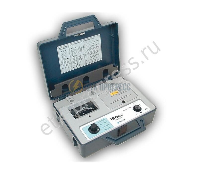Измеритель сопротивления изоляции MA 2060: Аналоговый измеритель сопротивления изоляции; Диапазон измерения от 500 кОм до 500 ГОм; Испытательные напряжения постоянного тока 500 В, 1000В, 2500 В, 5000В; Испытание на электрическую прочность (возможность удержания тестового напряжения по времени); Автоматический разряд нагрузки после завершения теста; Защитный проводник для снятия токов с поверхности изоляции; Измерение постоянного и переменного напряжения до 600 В; Индикатор разряда батареи;