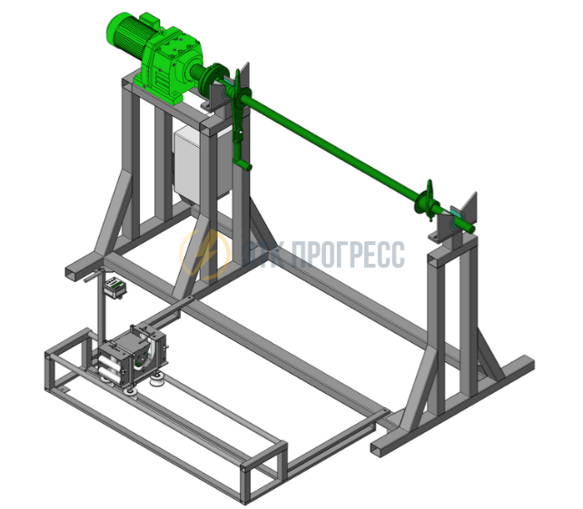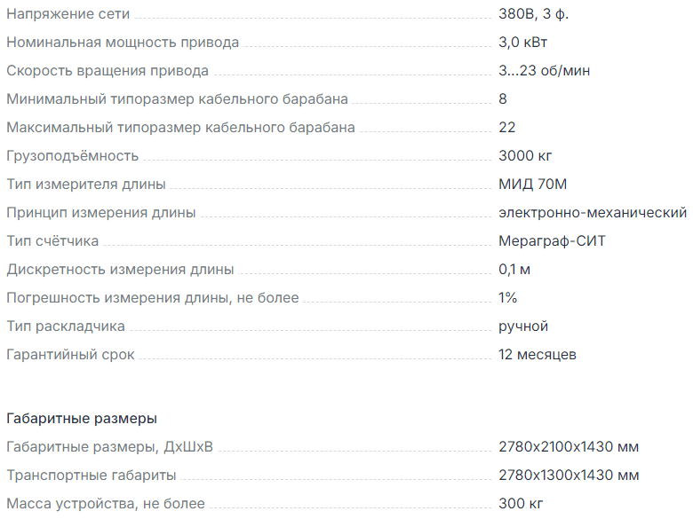 Станок состоит из мощной сварной рамы, выполненной из толстостенной профильной трубы, оси для отмотки на кабельные барабаны, автоматического раскладчика кабеля с установленным на нём измерителем длины МИД 70М и электропривода с управлением на базе преобразователя частоты.