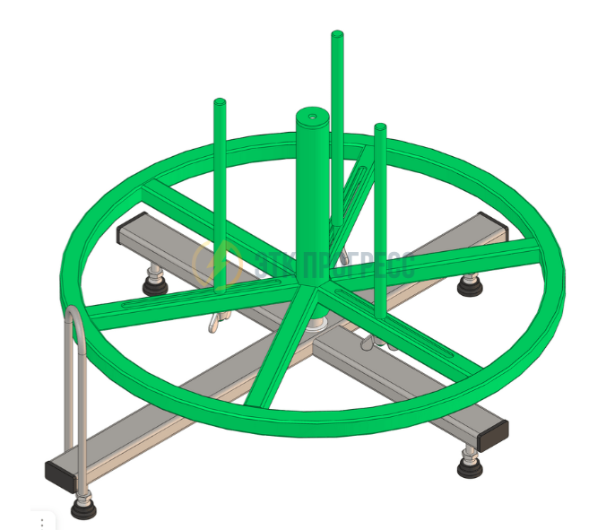Принцип работы устройства для размотки кабельных бухт: кабельная бухта устанавливается на вращающийся технологический барабан, свободный конец кабеля продевается через направляющую проушину. При протяжке кабеля бухта свободно вращается на технологическом барабане.