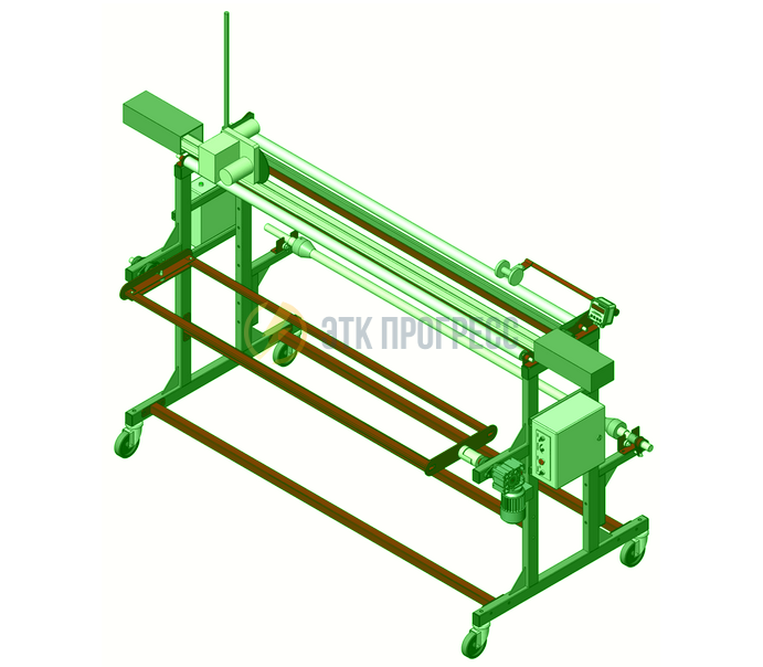 Отмоточный станок СНРМ-М7-П-АОЛ Прогресс предназначен для проведения мерных отмоток рулонных материалов, таких как плёнка, спанбонд, укрывной материал, ткань со стеллажа. Для лёгкого перемещения вдоль стеллажного ряда станок комплектуется поворотными колёсными опорами с тормозными механизмами (стопорами). Для поперечного отреза материала имеется встроенная автоматическая отрезная линейка с дисковым ножом.