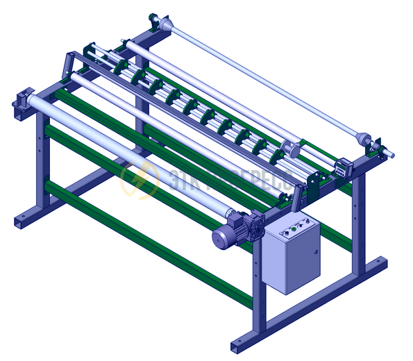Электропривод отмоточного станка состоит из червячного мотор-редуктора и системы управления на базе преобразователя частоты, который позволяет плавно менять скорость перемотки во всём заданном диапазоне, а также обеспечивает плавные пуск, остановку и остановку по достижению заданной на счётчике длины.