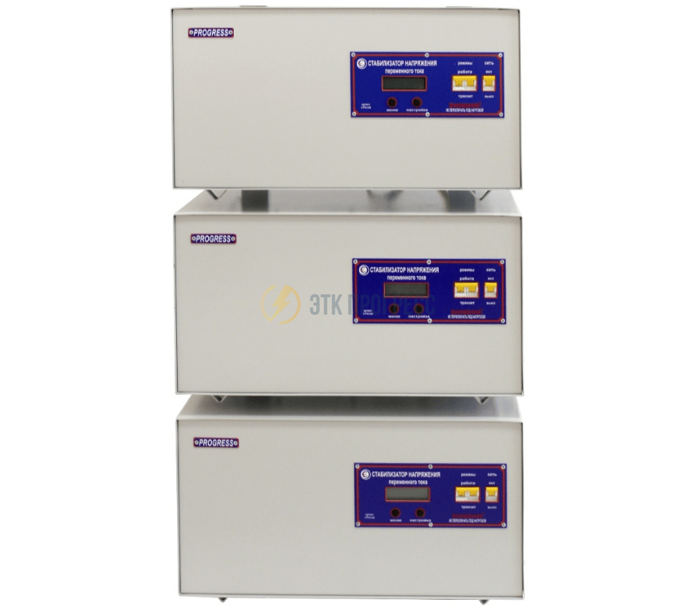 Трехфазный стабилизатор напряжения PROGRESS 9000G-3, состоит из трех однофазных стабилизаторов напряжения PROGRESS 3000G.