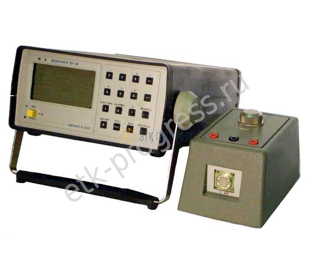 Вольтметр В7 45 предназначен для измерения постоянных токов, напряженнй, зарядов низкоомных и высокоомных источников. Предусмотрены автоматический выбор поддиапазонов измерения, возможность математической обработки результатов измерения сигналов по пяти программам, запоминания 100 измеренных значений за программируемый интервал времени, вычисления погрешности текущего значения измерений.
